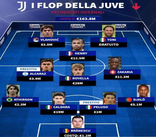 北京时间1月26日,德转评出了尤文图斯队史冬窗失败引援的11人阵容,他们在2022年冬窗花费8350万欧元引进的弗拉...