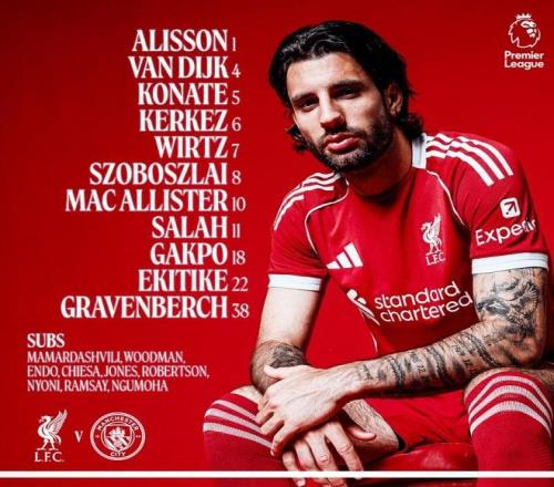 替补:25-马马尔达什维利、28-伍德曼、3-远藤航、14-费代里科-基耶萨、17-柯蒂斯-琼斯、26-罗伯逊、42-尼奥尼、47-卡尔文-拉姆齐、73-恩古莫哈