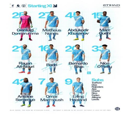 替补:1-特拉福德、3-鲁本-迪亚斯、4-赖因德斯、6-阿克、10-谢尔基、14-尼科-冈萨雷斯、47-福登、68-马克斯-阿莱恩、82-里科-刘易斯