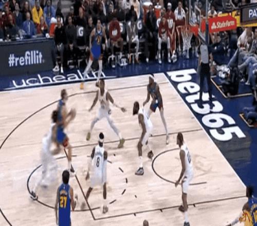 哈登试图找约基奇挡拆,约基奇目送,小哈达维切掉哈登给加雷特·阿伦的传球,逼得哈登自己撤步,射中全场第一个三分。