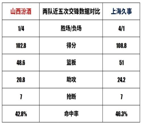 山西汾酒与上海久事在CBA俱乐部杯历史上共交手1次,山西汾酒0胜1负;两队在CBA联赛历史上共交手45次,山西汾酒21胜24负,本赛季两队交手1次,山西汾酒0胜1负。