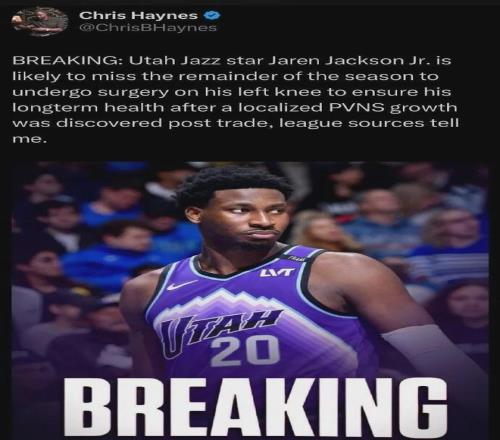 “3J”小贾伦-杰克逊将接受手术,切除左膝一处局部色素沉着绒毛结节性滑膜炎增生组织,可能赛季报销......