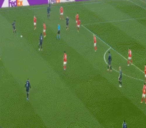 这一波的防守,最初就是边锋普雷斯蒂安尼退防到边后卫身侧限制拿球的卡雷拉斯。皇马这边回传后,本菲卡又让后腰巴列罗卡在肋部,让皇马很难对禁区内发起进攻。