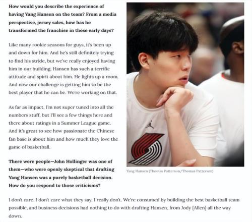 北京时间2月19日,开拓者总经理克罗宁接受了wweek媒体的专访,谈到了球队的方方面面,其中有两个问题是关于杨瀚森的。具体如下——