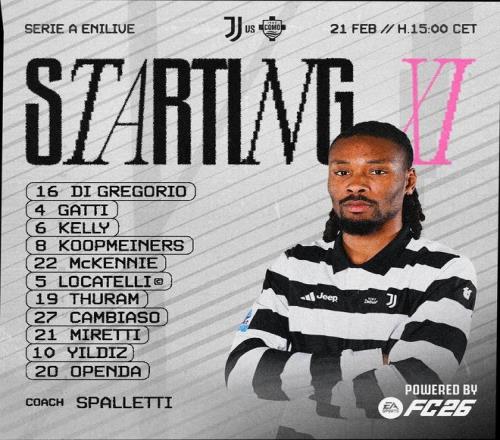 尤文图斯首发:16-迪格雷戈里奥、4-加蒂、6-凯利、8-库普梅纳斯、22-麦肯尼、5-洛卡特利、19-凯夫伦-图拉姆、27-安德烈亚-坎比亚索、21-米雷蒂、10-伊尔迪兹、20-奥蓬达