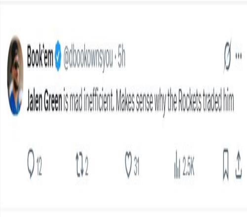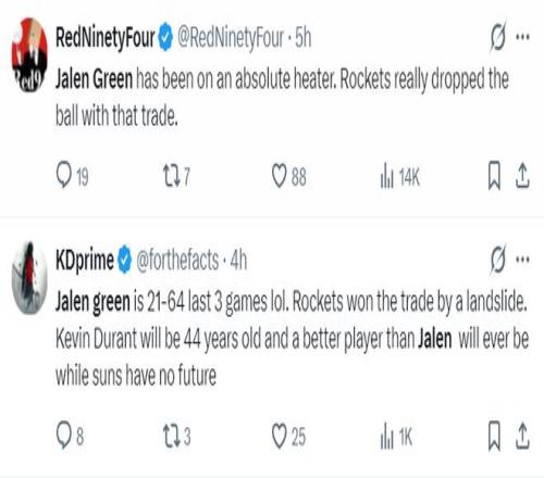 美媒:杰伦-格林过去三场比赛非常之低,哈哈。火箭队在这笔交易中获得成功,就算杜兰特年满44岁他也能比这个赛季的格林表现更好,太阳队毫无未来可言。