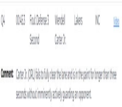 第二次漏判发生在距离比赛结束还有45.3秒,魔术的小卡特在没有积极防守对位球员的情况下,在己方禁区停留时间超过3秒,这是一次漏吹的防守三秒违例,湖人吃亏,魔术获利。