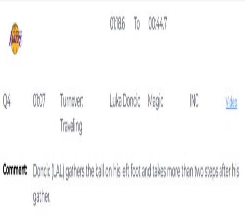 第一次漏判发生在距离比赛结束还有1分7秒,东契奇在左脚触地时完成合球,合球后多走了两步以上,构成走步违例。裁判没有响哨,这是一次漏吹的走步违例,湖人获利,魔术吃亏。
