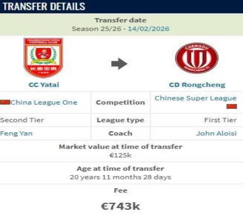 德转显示,贺一然从长春亚泰加盟成都蓉城的转会费约600万人民币。