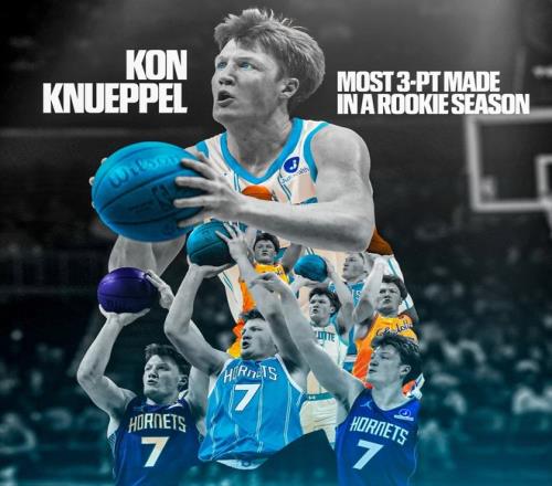 北京时间2月27日,黄蜂和步行者的比赛中,黄蜂新秀“康神”克努佩尔再次轰进8个三分球,赛季总三分球产量已达209个,超越国王队四号秀前锋基根穆雷,成为NBA历史新秀三分王!穆雷在新秀赛季曾投进206个三分球,但他用了80场,打破了当时米切尔的纪录,成为了NBA历史新秀赛季命中三分球最多的球员,但如今,这一历史再次被一个四号秀改写,而克努佩尔只用了59场!