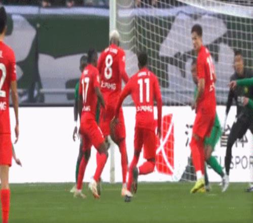 第29分钟,杨希右路横传,安永佳将球一挡,达万大脚解围,球打在恩科洛洛身上反弹击中门柱,国安逃过一劫。