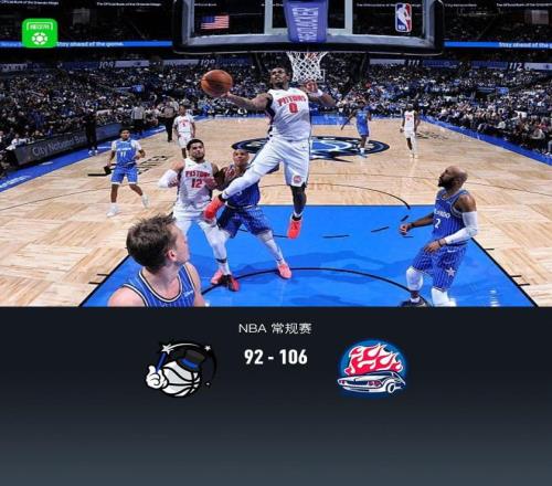 第四节魔术贝恩拿下7分,活塞托拜厄斯-哈里斯拿下6分,最终魔术92-106不敌活塞