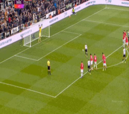 随后,已经少打一人的纽卡补上一点劣势,戈登先从卡塞米罗脚下断球,然后回到熟悉的左边路,成功制造了点球,并且顺利罚中: