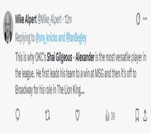 美记迈克-阿尔伯特写道:这就是为什么雷霆的SGA是联盟最具威胁的多面手,他能在麦迪逊广场花园带队取胜,又能登上百老汇的舞台,还能在《狮子王》中饰演角色。