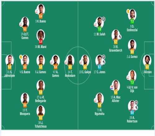 利物浦首发:1-阿利松、26-罗伯逊、2-戈麦斯、4-范戴克(80’5-科纳特)、38-赫拉芬贝赫、10-麦卡利斯特(81’42-尼奥尼)、17-琼斯、8-索博斯洛伊、11-萨拉赫(65’30-弗林蓬)、73-恩古莫哈(65’7-维尔茨)、18-加克波(86’68-莫里森)。