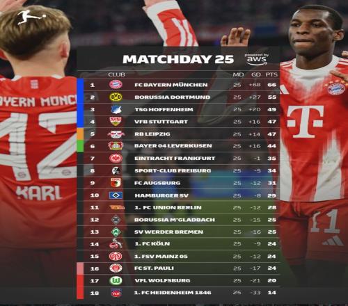 北京时间3月9日凌晨,云达不莱梅4比1大胜柏林联合,德甲联赛第25轮全部结束。积分榜方面,拜仁4比1大胜门兴,继续以11分的优势领跑;多特小胜科隆,没有让分差继续扩大;霍芬海姆4比2击败海登海姆仍列第三,与本轮憾平的斯图加特拉开了两分分差;RB莱比锡2比1击败奥格斯堡,积47分追平斯图加特,仅以净胜球劣势排名第五,勒沃库森积44分。