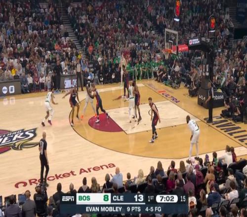 第二球持球与克塔的配合,骑士换防后对上了莫布利,利用莫布利被晃瞬间的失位直接干拔三分;