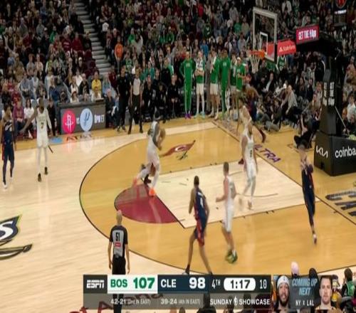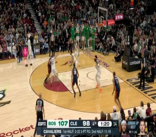 ——第四节剩下3分钟前,骑士追到12分,塔图姆单挑莫布利,一个非常漂亮的变向过人+突破上篮打成