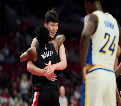 杨瀚森扣篮完成后,开拓者全场沸腾,主场球迷炸了锅,主场的DJ也嗨了,直接用中文一个字一个字地说:杨瀚森暴扣!小杨在波特牌面直接拉满。精彩还没完,韦斯利这一球突破后倒地,三四个队友过来拉他,暴扣板凳席的队友,全部过来庆祝,小杨也过去拉他,起身之后,韦斯利又来了一波庆祝,先是在底线附近跳舞,然后冲过来跟小杨贴胸庆祝,小杨被搞懵了,不知道是要起跳撞胸,还是撞肩,还是握手,最后小杨干脆来了一个爱的抱抱,两人都乐开了花。