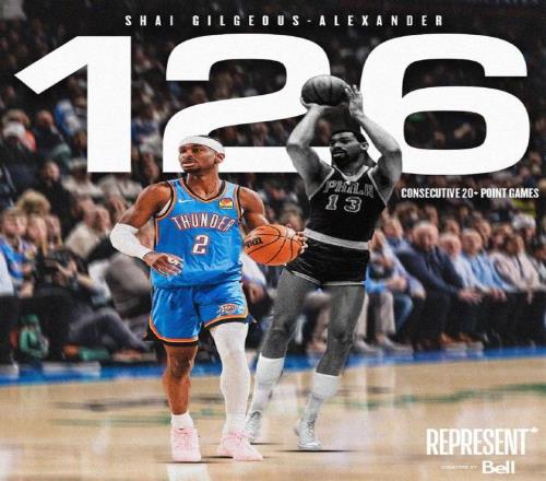 亚历山大连续126场得分20+,追平传奇巨星张伯伦保持的纪录,并列NBA历史第一。