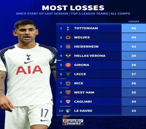 根据德转的数据统计,热刺上赛季以来各项赛事输掉45场,是五大联赛最多的球队。