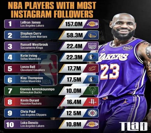 最近一份NBA球员Instagram粉丝数榜被整理出来,詹姆斯、库里、杜兰特、欧文这些名字都在前排。从数字本身看,分层很清楚:詹姆斯1.57亿是断档第一,库里5830万稳居第二,后面从两千多万到一千多万排成一串。这份榜单把“社媒人气”摆在台面上,谁是长期顶流、谁的曝光更稳定,基本一眼就能看出来。同样是看粉丝榜,你更在意这种“断档差距”,还是更想知道后面那一串谁最有机会继续往上追?