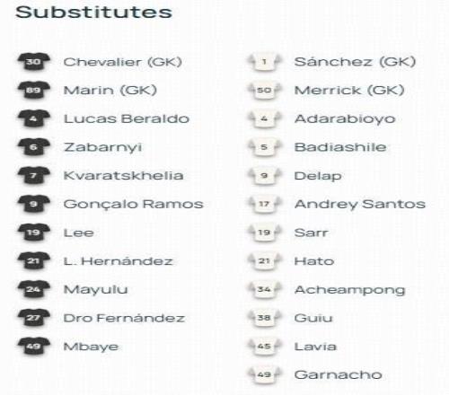 替补:4-贝拉尔多、6-扎巴尔尼、7-克瓦拉茨赫利亚、9-拉莫斯、19-李刚仁、21-卢卡斯、24-马尤卢、27-德罗-费尔南德斯、30-舍瓦利耶、49-姆巴耶、89-马林