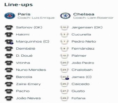 巴黎首发:39-萨福诺夫、25-门德斯、51-帕乔、2-阿什拉夫、5-马尔基尼奥斯、87-内维斯、33-埃梅里、17-维蒂尼亚、14-杜埃、29-巴尔科拉、10-登贝莱