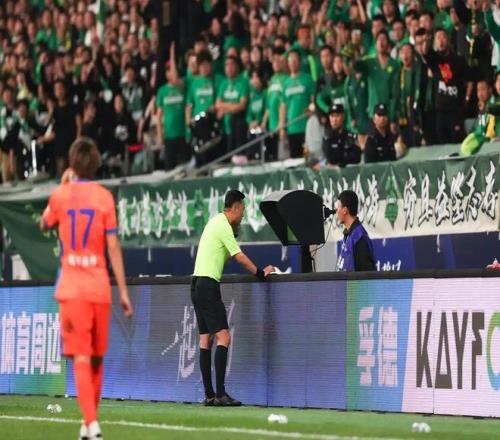 去年4月的京鲁大战,唐顺齐在场边回看VAR。(资料片)新华社发