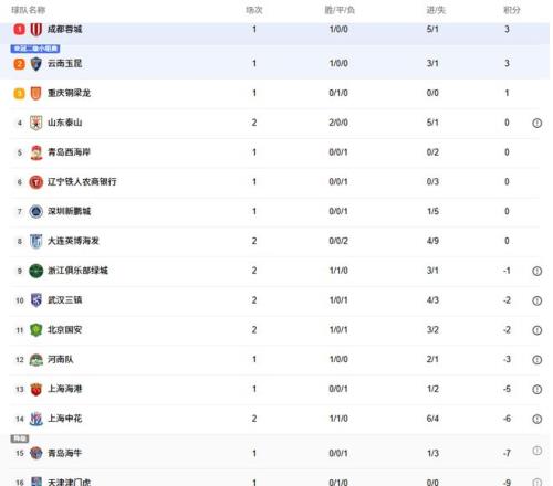 随着这2场比赛结束,中超积分榜的形势也发生巨大变化:1队0分飙升到第四名,蓉城队3分排名第一。