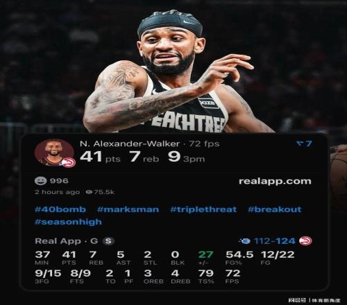 让我们把时钟拨回那场对阵魔术的魔幻之夜:沃克化身三分狙击手,21次出手如手术刀般精准,12次命中靶心,其中14次三分出手竟洞穿网窝!当终场哨响,41分的生涯新高伴随着7个篮板、5次助攻与2次抢断,+27的正负值如同给对手判了死刑。要知道,上赛季在森林狼时,他场均不过9.4分,而如今在老鹰的65场鏖战中,他已蜕变为场均20.3分的得分利器,3.2记三分命中数位列队内第二,仅次于全能战士杰伦-约翰逊(23分10.4篮板8.1助攻1.3抢断的恐怖数据)。