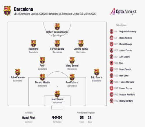 欧冠1/8决赛次回合,巴塞罗那主场对阵纽卡斯尔联,此役巴萨首发平均年龄为25岁18天,这是巴萨队史欧冠淘汰赛最年轻的首发阵容。