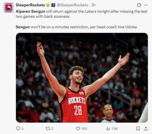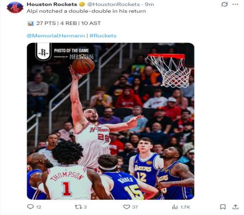 火箭官方写道:申京在复出后拿到了两双数据。