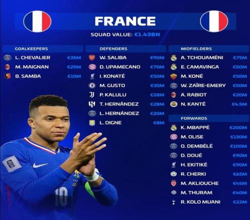 法国国家队新一期大名单德转身价榜:
