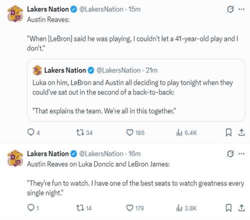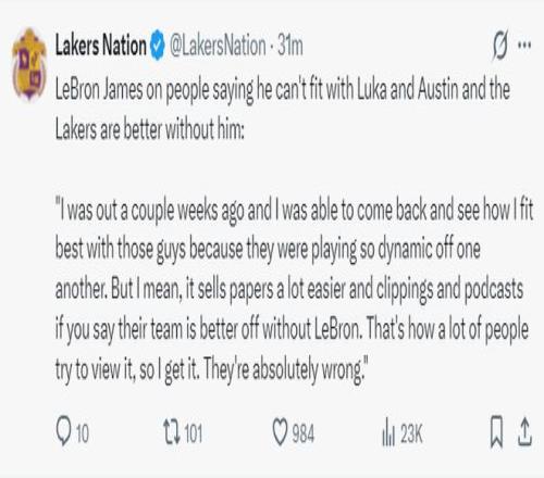 詹姆斯还回怼了那些说没有他湖人会更好的言论!他表示:我们三人的问题一直是时间问题,上赛季卢卡刚好我们在磨合,本赛季开局我、里夫斯都缺席了一些比赛,我们都在适应彼此,我回归后思考了怎么融入他们。外界喜欢制造话题是为了推销他们的报纸、播客,这些都是博眼球的方式我也能理解,但他们是完全错误的。