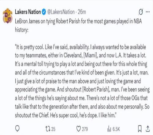 詹姆斯谈追平帕里什1611出场次数的纪录:很棒,就像我此前说的我一直都想为队友提供帮助,不管是在克村、迈阿密、洛杉矶都一样,这需要付出很大的努力与 巨大的精神力,你需要不停的参加比赛应付一切突发情况。我真的很热爱这项运动也很感激这项运动,我想跟帕里什击个掌。