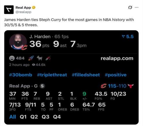 哈登在此役还创下了NBA历史第1神迹。数据显示,这是哈登生涯第105场比赛至少30分5板5助+5三分,追平斯蒂芬库里,并列NBA历史最多。