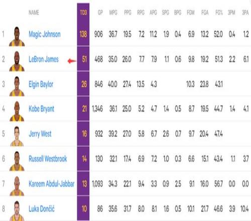 4.詹姆斯湖人队史第51次三双仅次于魔术师138次;