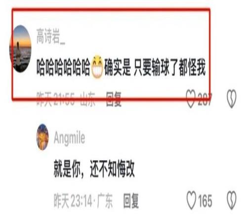 山东男篮最近的表现也比较糟糕,国手后卫高诗岩的状态也比较低迷,连续两场比赛的正负值分别是-16和-26,引发了球迷对他的不满。更有博主作出了视频,指出了高诗岩在比赛中的负作用。这个视频也引发了高诗岩本人的注意,他在下面留言:“确实是,只要输球了都怪我。”高诗岩明显说的是反话,意思就是说球队输球并不能怪他。随后就球迷恢复了高诗岩,表示“就是你,还不知悔改。”
