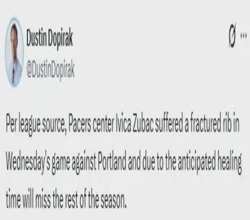 据供职于《印第安纳波利斯星报》记者Dustin Dopirak报道:祖巴茨因为肋骨骨折,提前结束本赛季征程。