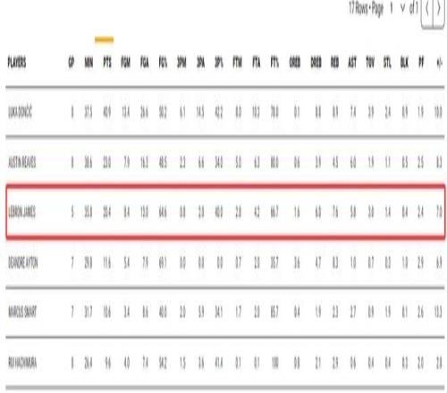 詹姆斯得分湖人第三,篮板湖人第二,助攻湖人第三,命中率湖人第二,三分命中率湖人第二,正负值湖人第四,很明显41岁勒布朗的贡献被大大低估了。