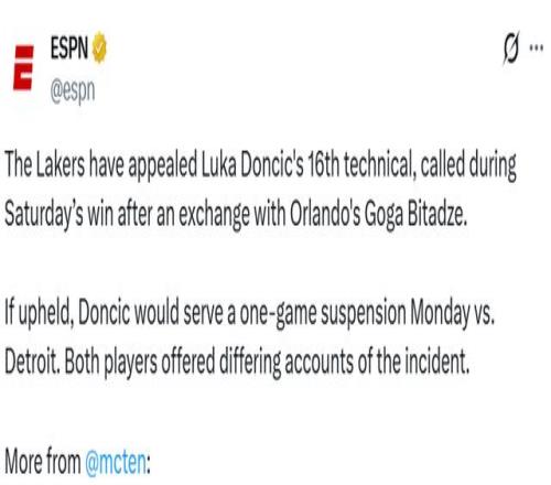 这是东契奇本赛季第16次技术犯规。如果这次技犯不予撤销,按照规则,他将因为技犯满16次,在下周二湖人对阵活塞的比赛中自动禁赛一场。