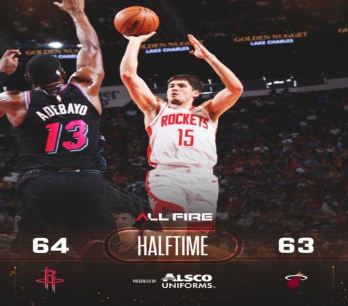 火箭队的谢泼德上半场得到18分和5次助攻,汤普森得到16分和8个篮板,杜兰特得到11分;热火队的阿德巴约得到20分和13个篮板,希罗得到11分,冯特奇奥和拉尔森各得到10分。