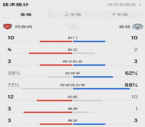 来看看数据:控球率38%对62%,射正4对2。