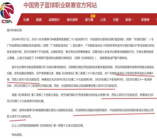 根据CBA公司的相关规则,对宁波队球员鲁吐布拉进行罚款50000元,外加停赛1场的处罚。同时,对宁波队总经理刘家成,罚款10000元,原因就是他负有管理责任。