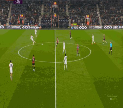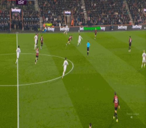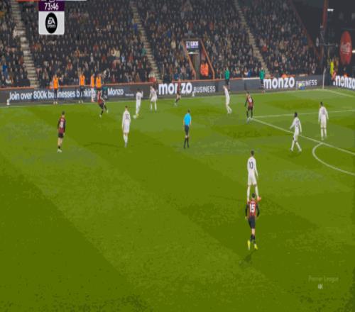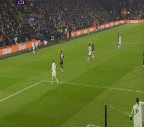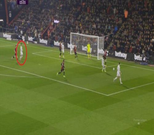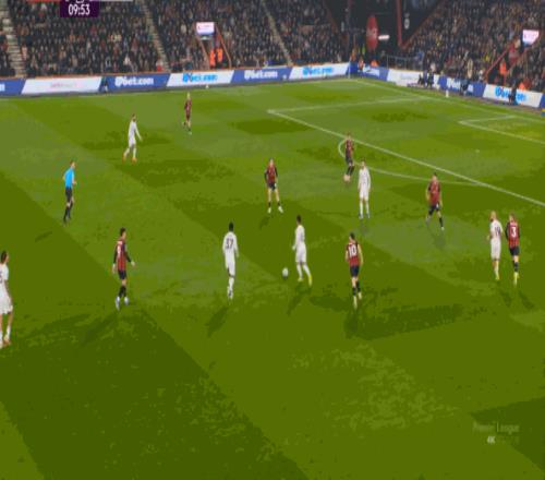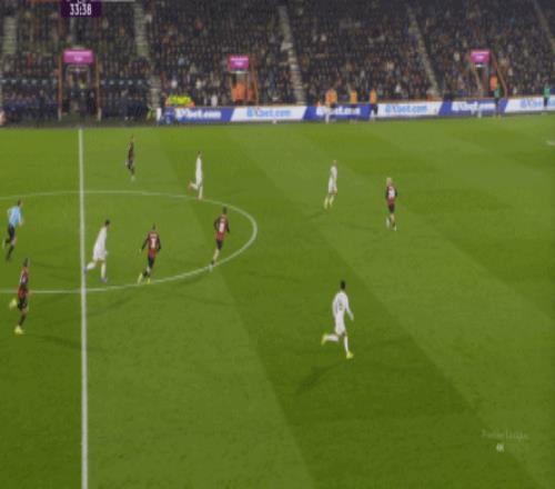 那么在这场比赛,曼联的弱点是如何暴露出来的?其实就发生在第27分钟这次高位逼抢,伯恩茅斯分到边路之后,库尼亚稍微松懈一点点,他们就成功抢到了卡塞米罗的身前,从而制造了他的黄牌: