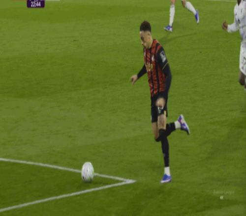 这个时候,曼联想要打出优势,就需要找其中还能勉力维持的点位,这个点位就是库尼亚,一方面他的确是比较全面,所以身体撑得住技术的基本发挥,另一方面就是他对位的伯恩茅斯右后卫阿莱士-希门尼斯比较弱,所以在这个一对一里,曼联可以打出优势,从而形成局势上的平衡,甚至是反超: