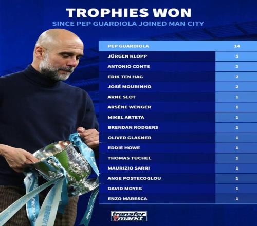 北京时间3月24日,在曼城击败阿森纳赢得本赛季联赛杯冠军之后,来自德转的统计指出,自瓜迪奥拉2016年7月接手曼城以来,这位西班牙名帅已经率队14次赢得冠军奖杯,这一数据领先于同期所有在英超有过执教经历的主帅。