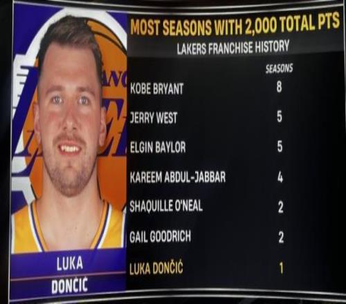 算上这场比赛的32分,东契奇赛季总得分2005分,是湖人队史第七位单赛季得分突破2000分的球员。