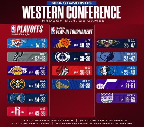 北京时间3月24日,NBA常规赛打完,西部的排名又有了微弱的变化,休斯顿火箭队从第四直落第六,马刺大胜热火拿到6连胜后已经提前锁定西南赛区的冠军;湖人虽然惜败活塞但因为此前的9连胜依旧稳居第三,快船狂胜雄鹿拿到二连胜继续排第八压制开拓者。